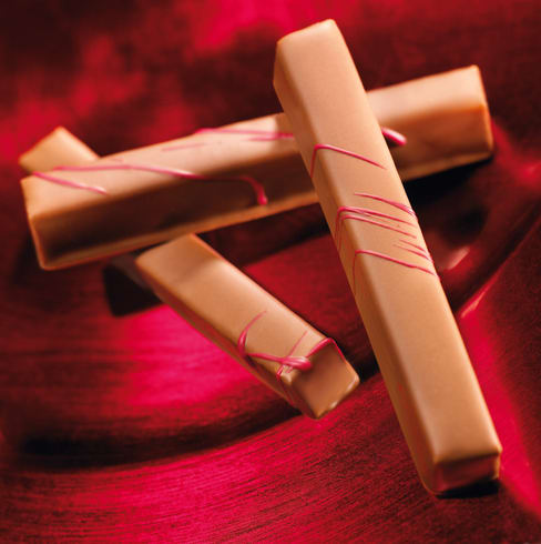 Überziehen Sie sie mit der Milchkuvertüre und kolorieren Sie sie nach Austritt aus dem Opalys-SchokoladenÜberzugsverfahren mit roter Kakaobutter. Tipp: Es ist möglich, dieses Rezept zu verändern und die Aromatisierung des