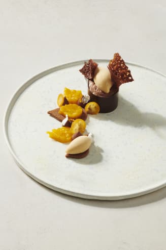 Anschließend die Gavotte-Stücke und den Nocken aus Joghurt-Mandarinen-Eis auflegen.