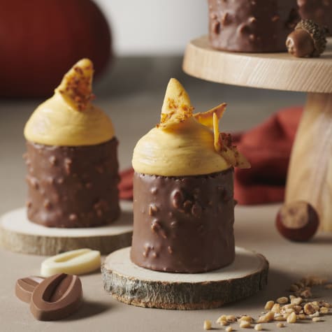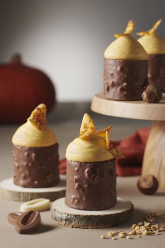 Die Stieleis-Glasur mit AZÉLIA 35 % vorbereiten. Die Möhrenkuchen durch Eintauchen in die Stieleis-Glasur glasieren. Darauf achten, dass nur der untere Teil überzogen wird. Die Ganache IVOIRE 35 % mit Vanille und Möhrensaft aufschlagen, bis eine elastische Textur entsteht, die sich mit dem Spritzbeutel verarbeiten lässt. Die Ganache mithilfe eines Spritzbeutels mit 18-mm-Tülle auf jeden Möhrenkuchen dressieren. Zum Schluss einen Möhren-Hippen auf die Ganache legen.