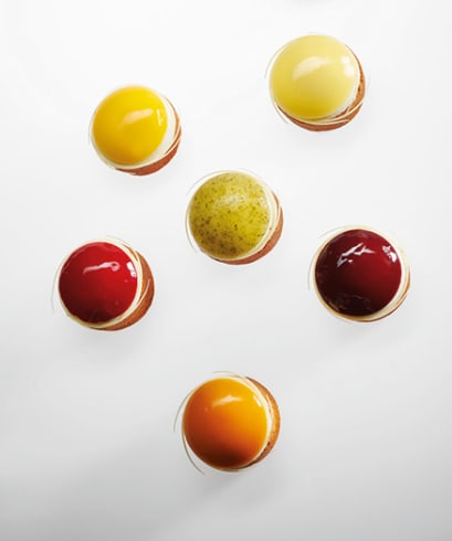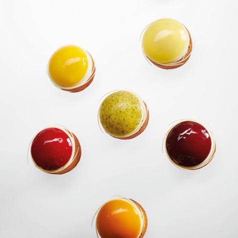 Die schaumige Ganache-Creme aufschlagen und 20 g auf den Boden der FlexipanHalbkugelform mit einem Durchmesser von 8 cm geben, anschließend ein Biskuit in jede Vertiefung drücken, damit sich die schaumige Ganache-Creme dem Durchmesser des Biskuits anpasst, einfrieren.
