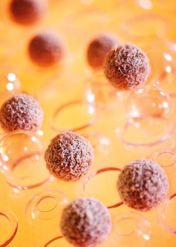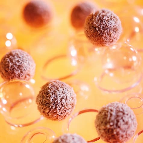 Die Trüffel nach der Kristallisation in ein Becken legen und dann leicht mit temperierter Milchkuvertüre überziehen.