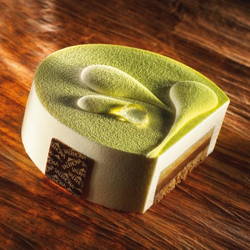 Wenn die Sahnecreme mit Praliné zu dick ist, sie erwärmen, dann in die Ringe mit dem mit Kakaobutter wasserdicht gemachten Streuzel eingießen. Das grüne Apfelkompott herstellen und es kalt auf die Sahnecreme mit Praliné gießen. Einfrosten. Nachdem die Füllung (Streuzel, Sahnecreme mit Praliné und Apfelkompott) entformt wurde, die Mousse Ivoire mit Vanille herstellen. Die 210 g Mousse in jeden Aufbauring eingießen und die Füllung auflegen. Rasch einfrosten. Die Süßspeisen entformen, dann eine Chantillycreme mit Vanille herstellen,sie wird dazu dienen, um den Dekor in Tropfenform herzustellen. Die Süßspeisen ein erstes Mal weiß besprühen, dann mit der apfelgrünen Sprühmischung ein leichtes Relief geben. Zum Schluss einen Tropfen Absolu Cristal Neutralen Überguss beifügen und ein mit Valrhona bedrucktes Schokoladenquadrat