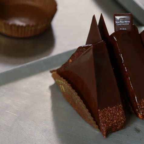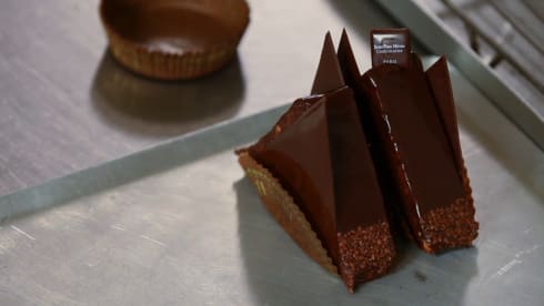 Jeden Streifen auf einen Aluminiumträgerplatte von 375x100mm legen, den Streifen mit einer heißen Klinge diagonal überschneiden. Die Platte wenden und die beiden Teile zusammensetzen. Mit einer Ganache pyramidenförmig aufbauen, glätten und bei 4 °C aufbewahren. Nach 2 Stunden mit Zartbitterschokolade von Valrhona glasieren. Mit zwei dreieckigen Blättchen Schokolade dekorieren. Aufbewahrung: 3 Tage / Verzehren bei: 6 °C bis 8 °C.