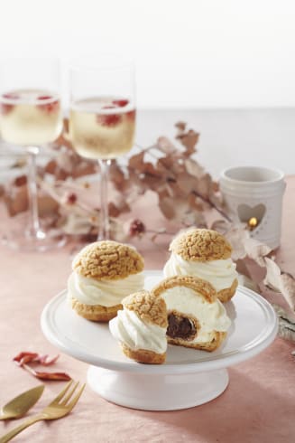 ANRICHTEN / ZUBEREITUNG: Nach dem Abkühlen ein Loch in die Unterseite der Windbeutel stechen und mit STREICHCREME füllen.Die großen Windbeutel in der Mitte quer aufschneiden, dann den Boden mit der schaumigen Ganache-Creme IVOIRE 35 % und Vanille füllen und einen kleinen schon mit STREICHCREME gefüllten Windbeutel hinein-setzen.Abschließend eine großzügige Rosette aus schaumiger Ganache-Creme aufspritzen, sodass der kleine Wind-beutel vollständig bedeckt ist. Den oberen Teil des großen Windbeutels darauflegen.