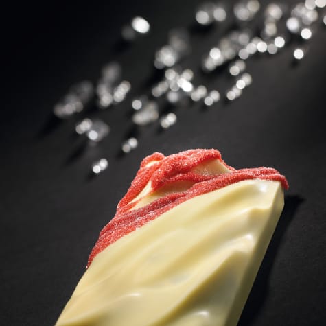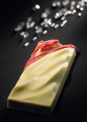 Con ayuda del Chocolate Ivoire atemperado, moldear los deliciosos. Dar la vuelta, dejar escurrir el chocolate unos instantes, nivelar, después dejar cristalizar. Limpiar y dejar cristalizar de nuevo a 17°C. Con una manga sin boquilla rellenada de pasta de almendras montada y de una manga sin boquilla rellenada de pasta de fruta fresa, realizar un efecto marmolado rellenando una primera vez con 25 g de pasta de fruta, después 60 g de pasta de almendra y repetir la operación. Cerrar una primera vez las tabletas con chocolate atemperado alisando con ayuda de un triángulo. Dejar cristalizar ligeramente. Seguidamente, con una manga, a un lado del molde colocar un poco de chocolate atemperado, después colocar una hoja guitarra, mantener con la mano el conjunto pinzándolo con el molde. Coger un triángulo y alisar una segunda vez tirando del chocolate a través de la hoja guitarra y ejerciendo una presión. Dejar cristalizar antes de retirar la hoja guitarra. Una vez desmoldada, con ayuda de una manga con boquilla de 6 mm de diámetro, escudillar 15 g de pasta de fruta de fresa de manera irregular por encima del delicioso. Espolvorear azúcar en polvo sobre la pasta de fruta y retirar el excedente.Truco Para San Valentín: Pegar pétalos de rosa azucarados sobre el Delicioso.Para Nochevieja : Dibujar la fecha del nuevo año con la pasta de frutasde fresa. Deje simplemente correr sumaginación.