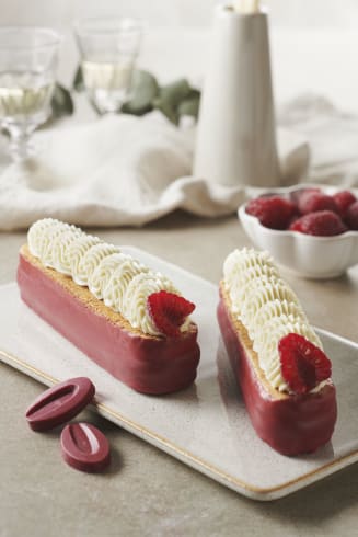 Glasear los éclairs con el glaseado eskimo INSPIRATION FRAMBUESA y volver a meter en el congelador durante 30 minutos.
