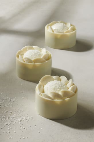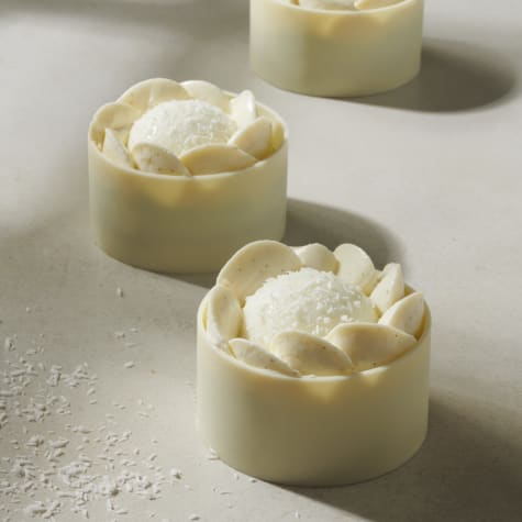 Acabado: Glasear las cúpulas de mousse de coco con el glaseado blanco, espolvorearlas ligeramente coco rallado y ponerlas sobre el montaje de compota y cremoso de aguacate.