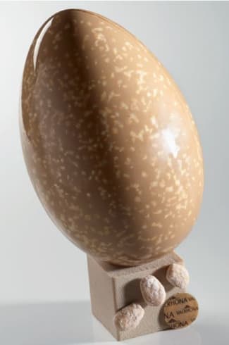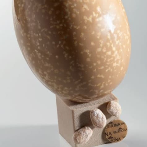 Esparcir a continuación las almendras picadas tostadas. Dejar que cristalice. Moldear con Inspiration Almendra atemperada. Voltear, dejar escurrir un instante y alisar. Escurrir los moldes entre 2 reglas. Antes de que se produzca una completa cristalización, quitar la rebaba y moldear una segunda vez (golpear más o menos fuerte según el espesor deseado). Dejar cristalizar, quitar de nuevo la rebaba y colocar en la nevera unos minutos para iniciar la cristalización, mantener a 17 ºC hasta que el desmoldado se produzca solo. A continuación, pegar las dos mitades de los huevos fundiendo el borde de cada pieza sobre una placa caliente (entre 58 y 60 ºC) para obtener una soldadura resistente. Dejar que cristalice.