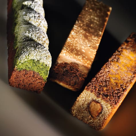 En un molde Flexipan en forma de barrita de 50 cm de largo por 3 cm de ancho, echar 40 g de streuzel cocido. Con una manga echar 220 g de pasta para magdalena sobre el streuzel. A continuación echar 50 g de Praliné Almendras-Avellanas insertando directamente la manga en la pasta para magdalenas de forma que obtengamos bolitas de praliné una vez cocido. Añadir tapiz siliconado y cubrir con una bandeja los moldes en forma de barritas, de forma que evitemos que la masa infle. Hornear a 175°C durante 18 minutos. Introducir en el congelador y reservar. Desmoldar.
