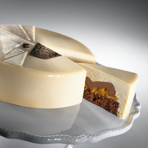 Montaje: Una vez el bizcocho cocido y enfriado, con ayuda de un sacabocados de 14 cm de diámetro cortar discos. Con ayuda de una manga sin boquilla, poner irregularmente unos 100 g de compota naranja-pasión por bizcocho. Con ayuda de una manga con boquilla de 10 mm de diámetro, preparar irregularmente unos 100 g de cremoso Guanaja sobre la compota naranja-pasión para realizar el interior. Congelarlo todo. Preparar los aros para tarta de 4.5 cm de altura y de 16 cm de diámetro y ponerles una tira de rhodoïd. Realizar la mousse ligera Café Opalys después colar rápidamente unos 300 g por aro de manera que se realice un montaje al revés. Rápidamente depositar el interior. Congelarlo todo. Acabado: Desmoldar las tartas, después glasearlas con el glaseado Opalys café. Espolvorear polvo de café molido sobre una hoja guitarra. Colar chocolate Opalys atemperado por encima, rápidamente poner una segunda hoja guitarra, extender con ayuda de un rodillo. Dejar espesar la cobertura, después cortar triángulos irregulares con un cuchillo. Dejar cristalizar. Colocar seguidamente las decoraciones sobre la mitad de la tarta para crear un efecto mosaico, después poner un grano de café.