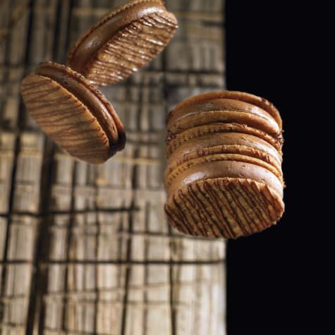 Rebajar la pasta sablée a 3 mm de espesor. Con un sacabocados de 5 cm de diámetro, cortar los sablés y colocarlos sobre una tela siliconada perforada. Posibilidad de cortar los sablés en forma rectangular (8 x 2cm). Con ayuda de una manga sin boquilla, rellenada con praliné 70% puro, realizar pequeños trazos en la superficie de los discos de pasta sablée. Cocer en un horno a 150°c durante unos 13 min. Rellenar los sablés cocidos con praliné montado, después tapar con otro sablé apretando ligeramente de manera que se reparta el praliné sobre toda la superficie del sablé. Truco : Puede variar las decoraciones y la manera de hacer, por ejemplo: sablé cocido entre dos silpain, sablé cocido con un poco de azúcar moreno en la superficie, sablé cortado en longuets etc...