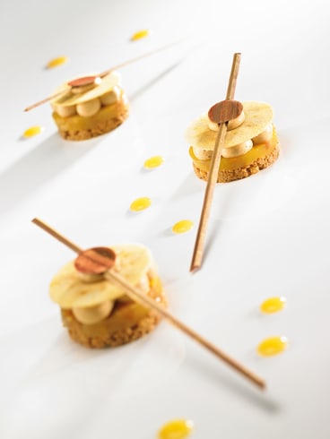 Colocar 25 g de sablé praliné prensado en los aros de 6 cm de diámetro, apretar ligeramente con ayuda de una cuchara y reservar en la nevera. Realizar la gelée de manzanaGala, colar 30 g en los aros de 6 cm de diámetro, conservar en la nevera hasta el momento del escudillado. Montar en la batidora la ganache montada, rellenar una manga conboquilla nº10 y reservar en la nevera.DECORACIÓN Con ayuda de cobertura de leche atemperada, realizar discos de 6 cm de diámetro entre dos hojas guitarra. Dejar cristalizary reservar para el servicio. Mezclar polvo de oro con licor y con un pincel hacer trazos sobre una hoja guitarra. Dejar secar. Colocar la cobertura de leche sobre hoja decorada ycubrir con otra hoja, después extender. Antes de la cristalización, cortar círculos de 2 cm de diámetro. Siempre con cobertura de leche atemperada, colocarla sobre una hojaguitarra y con ayuda de una espátula serrada realizar palitos. Dejar cristalizar. Pintar los palitos con polvo de oro y cortar a 15 cm de largo. A 5 cm del borde de los palitos, pegarlos círculos de oro de 2 cm para realizar una decoración que represente la aguja de unreloj. PRESENTACIÓN An el centro de un plato redondo, colocar un punto de ganachemontada para pegar el sablé prensada. Escudillar seguidamente un cordón de ganache montada sobre el sablé. Desmoldar la gelée de manzana sobre un disco de chocolate deleche y colocar el conjunto sobre el sablé. Escudillar 7 bolas de ganache montada praliné sobre la gelée manzana canela, después colocar un chips de manzana Granny Smithpor encima. En el centro colocar de nuevo una bola de ganache montada. Poner sobre ésta la decoración de chocolate y decorar el plato con puntos de salsa de manzana. Servirenseguida.