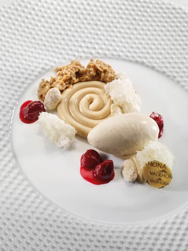 Colocar el sablé crujiente junto a la espiral para que queden unidos. Colocar unas guindas, trozos de bizcocho esponjoso y almendras caramelizadas. Por último, colocar una quenelle de helado de leche.Adapte su receta según la temporada: sustituya la guinda por mango, suprema de naranja o kumquat.