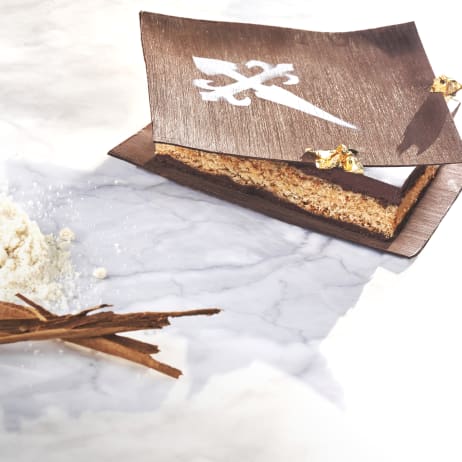 Con un rodillo, picar de manera desigual la pasta sablé, después añadir el azúcar moreno y las crêpes dentelles. Fundir la mantequilla separada del chocolate IVOIRE 35% a 45/50°C. Raspar los granos de vainilla con el dorso de un cuchillo. Mezclar de manera delicada todos los ingredientes con una lengua pastelera. Escudillar enseguida en un aro y «presionar» con una cuchara.