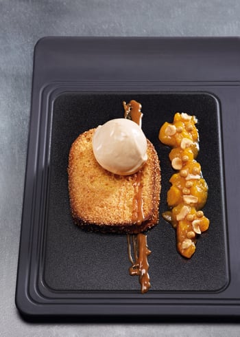 Truco: Para la versión congelada, habrá que cocer las torrijas a 150ºC durante al menos 20 minutos. Con ayuda de una cuchara colocar unos 32 g de mermelada de albaricoque a lo largo. Poner una rebanada de torrija al sacarla del horno, después con una manga sin boquilla realizar trazos de salsa sobre ésta. Terminar el postre colocando una bola de helado de leche al praliné, trocitos de frutos secos en sablé y PERLAS CRUJIENTES DULCEY. Servir enseguida.