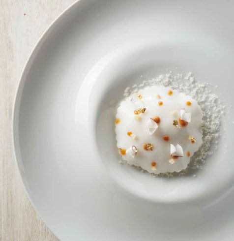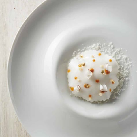 Añadir 40 g de arroz con leche sobre el sorbete de coco, después 10 g de praliné almendra caramelizado. Con un cortapastas acanalado, cortar un disco de velo de coco y ponerlo encima del arroz con leche. Escudillar pequeños puntos de praliné con el cornete sobre el velo.