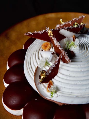 Décorer avec des lamelles de noix coco fraîche, le décor de chocolat, une noisette torréfiée, de la linaire comestible et de la feuille d’or.