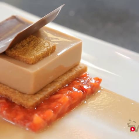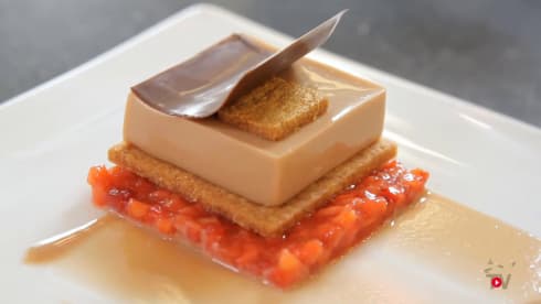 Dressage : Déposer sur une assiette un peu de sauce praliné puis a l’aide d’un triangle, écraser la sauce de façon à réaliser une bande. Déposer ensuite un emporte pièce carré de 8x8 cm sur un coin de la sauce et garnir de 35 g de mélange de fraises. Recouvrir les fraises avec un carré de streuzel et déposer à l’aide du carré inox une gelée praliné sur le dessus. Démouler. Décorer d’un carré de streuzel de 2x2 cm au milieu de la gelée praliné et finir par le décor carré galbé en chocolat. Servir aussitôt.