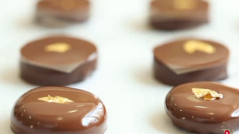 Retourner le moule, en le tapotant si nécessaire, pour démouler les bonbons. Conseil : pour donner un aspect plus artisanal aux bonbons, y verser un filet de chocolat tempéré en dessinant des lignes. Vous pouvez aussi ajouter du grué de cacao, des perles craquantes et votre logo.