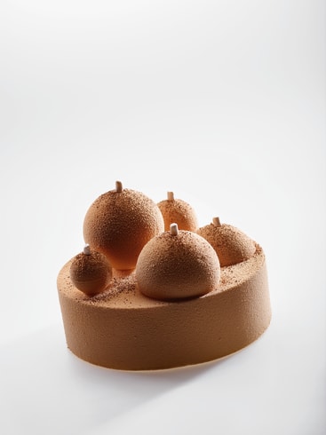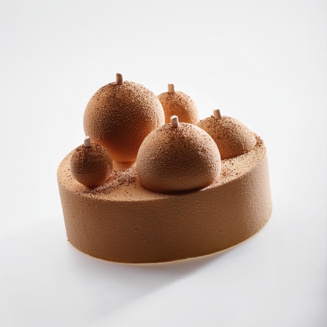 Surgeler puis démouler les inserts. Chemiser des cercles de 16 cm de diamètresur 4,5 cm de haut avec la crème glacée Caramélia.