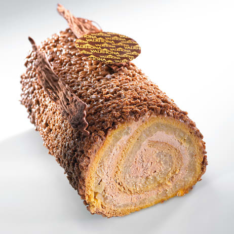 Foisonner la ganache une seconde fois pendant 30 secondes pour obtenir plus de fermeté. Verser la ganache dans une poche à douille et chemiser le moule de ganache. Étaler avec une spatule au fur et à mesure pour éviter les bulles. Garnir les ¾ du moule flocon en laissant un rectangle au centre de la taille du moule insert. Récupérer le biscuit et découper une bande de la taille du moule insert. Démouler la mousse chocolat et le tube de confit de cassis. Placer le confit de cassis dans le fond du moule flocon sur la ganache en appuyant légèrement. Ajouter de la ganache sur les côtés pour bien caler le tube. Ajouter la mousse chocolat par-dessus. Enfoncer et enlever l’excédent à l’aide d’une spatule. Terminer par le biscuit et enlever l’excédent. Placer la bûche au congélateur pendant 2 à 3 heures.