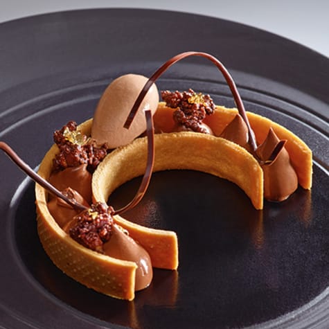 Réaliser des points de sauce entre chaque goutte de crémeux. Décorer avec des filaments de chocolat et de la feuille d’or.