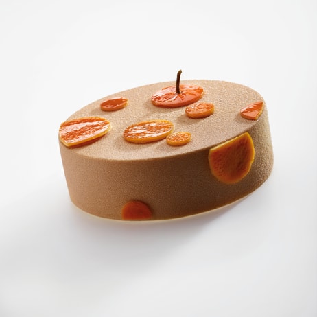 Surgeler le tout. Découper des cercles de 14 cm de diamètre dans le crémeux et réaliser un velours à l’aide de l’appareil pistolet.