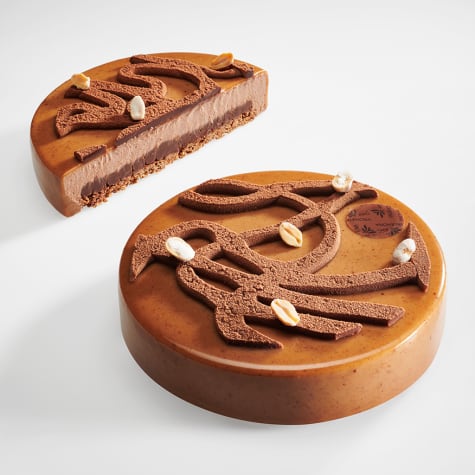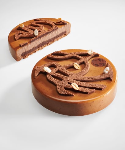 Démouler puis glacer les entremets. Déposer un disque de crémeux. Décorer (voir photo) avec quelques cacahuètes sablée et un logo maison.