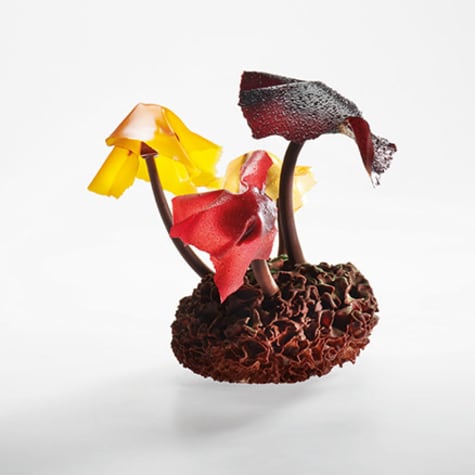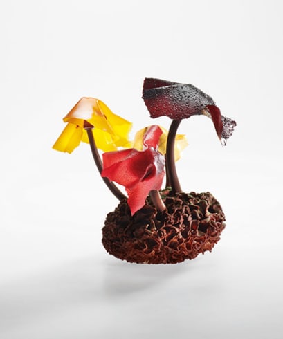 Positionner quatre sarments de chocolat par base. Coller un disque de couverture Guanaja à l'extrémité supérieur de chaque sarment.
