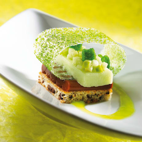 Démouler les inserts et réaliser la mousse. En déposer 200 g dans un cercle puis placer l’insert au centre de manière à réaliser un montage « à l’envers ».