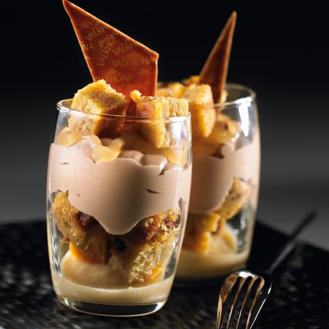Peser 700 g du biscuit et le verser dans un tapis silicone à rebord 34 x 34 cm puis le cuire 12 minutes à 170°C. Placer les verrines dans le congélateur. Tempérer la crème banane passion à environ 20 / 25°C puis à l’aide d’une poche sans douille, verser 20 g par verrine puis les incliner afin de réaliser une vague. Surgeler. Couper des cubes de 5 mm du gâteau à la banane. Disposer environ 5 cubes de biscuit et quelques perles craquantes Caramélia. Surgeler. Réaliser la mousse Jivara jasmin, couler aussitôt environ 35 g par verrine. Surgeler. Au moment de la finition, couler la gelée citron-jasmin, disposer un cube de cake banane et un logo maison.