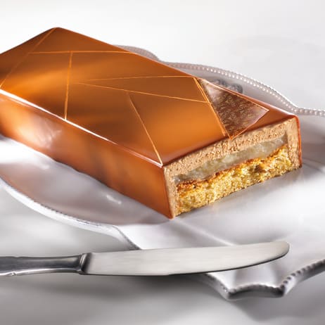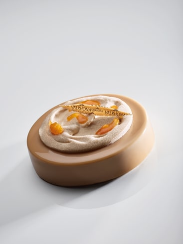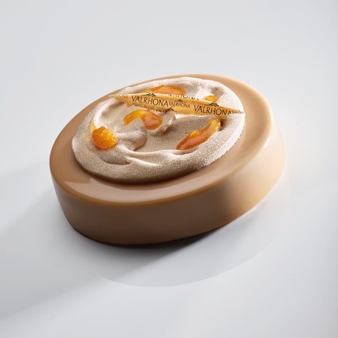 Réaliser la pâte sablée et la compotée. Étaler la pâte sablée à 3 mm d’épaisseur et détailler des disques de 14 cm de diamètre. Cuire environ 12 minutes à 150°C. Couler aussitôt dessus 80 g de biscuit moelleux. Parsemer 25 g d’abricot moelleux coupés en brunoise puis terminer la cuisson à 180°C pendant environ 12 minutes. Une fois le biscuit refroidi, étaler 60 g de compotée d’abricot. Surgeler. Couler 90 g de crème brûlée puis surgeler. Réaliser la mousse anglaise et couler aussitôt 250 g par cercle de 16 cm de diamètre et 3,5 cm de hauteur préalablement chemisé d’un rhodoïd. Ajouter l’insert afin de réaliser un montage à l’envers. Surgeler l’ensemble. Dans un cercle de 12 cm de diamètre muni d’un rhodoïd, couler 120 g de mousse plus froide puis lui donner du volume avec une cuillère (voir photo). Surgeler. Décercler et retourner les entremets puis les glacer. Décercler le «nuage» de mousse puis à l’aide d’un pistolet déposer un voile d’appareil à pulvériser afin d’obtenir un effet velours. Déposer délicatement au centre de l’entremets. Terminer avec quelques gouttes de compotée abricot mixée avec de l’Absolu Cristal.