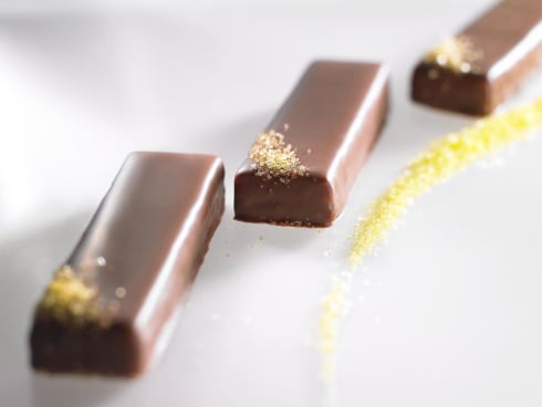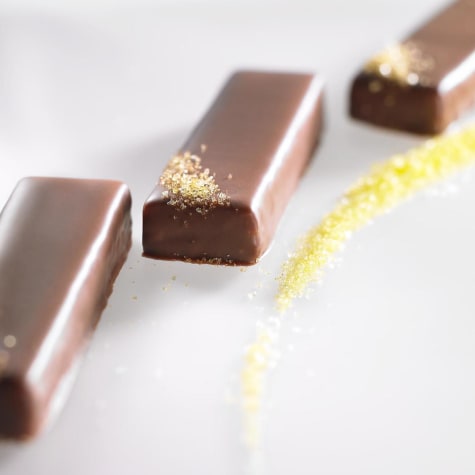 Pré enrober le praliné d’EQUATORIALE LACTEE 39% puis découper à la guitare des bandes de 22,5 mm de largeur puis couper ces bandes en tronçon de 8 cm environ.Enrober ces tronçons de couverture lactée puis les décorer légèrement d’un sucre coloré orange.