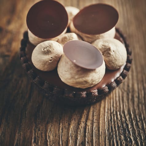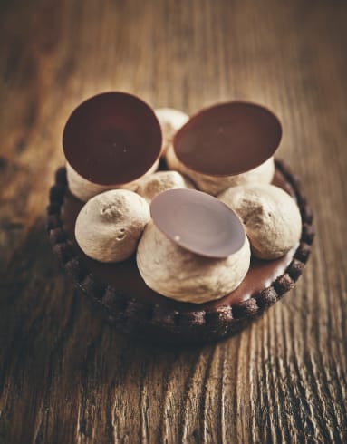 Fouetter doucement la ganache montée jusqu’à obtenir une texture de glace à l’italienne. Garnir une poche à douille et dresser sur les tartelettes des petites boules de ganache, puis disposer harmonieusement les palets de chocolat extrafins.