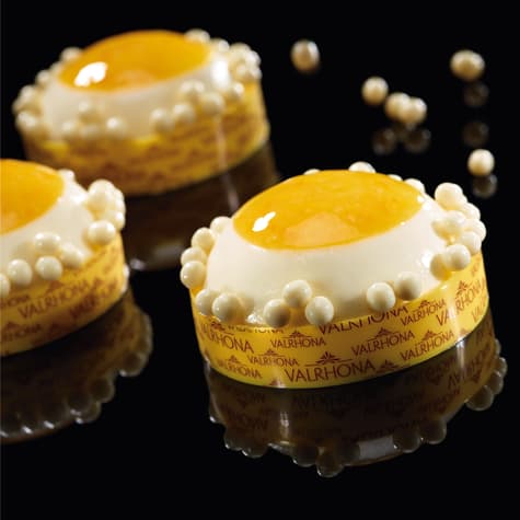 Couler le Pain de Gênes en cadre sur une épaisseur d’1 cm. Cuire au four ventilé à 180°C pendant 14 minutes. Sur le biscuit pain de Gênes, étaler. 500 g de compotée d’orange et parsemer de 250 g de perles craquantes Opalys. Congeler et détailler 60 inserts à l’aide d’un emporte pièce rond de 5,5 cm de diamètre. Dresser à la poche 15 g de compotée orange dans le fond de chaque moule demi-sphère de 6 cm de diamètre et congeler. Foisonner la ganache montée jusqu’à obtenir une texture mousseuse mais souple. A l’aide d’une poche, dresser 25 g de ganache montée sur le confit puis déposer l’insert de biscuit et de perles en appuyant légèrement. Surgeler. Démouler les petits gâteaux puis les pulvériser avec le nappage Absolu Cristal chaud. Confectionner des bandes (1,5 cm x 23 cm) de chocolat blanc coloré au beurre de cacao jaune. Décorer avec des perles craquantes Opalys autour des petits gâteaux.