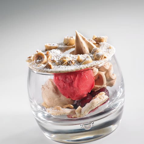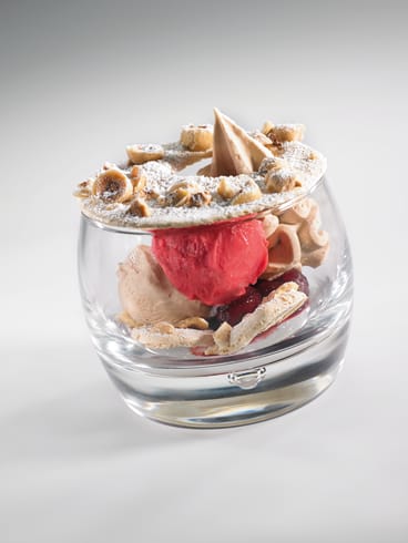 A l’aide d’une spatule étaler la meringue à environ 2 mm sur une toile siliconnée.Saupoudrer de noisettes concassées grillées puis de sucre glace.Déposer 20 g de confit de framboise au fond et au bord de la verrine.A côté du confit déposer environ 3 g de brisure de meringue praliné.Sur les brisures déposer une boule de glace au lait praliné noisette 55 (environ 25 g).Surmonter la boule de glace d’une boule de sorbet framboise (environ 25 g).Dresser au syphon sur le confit de framboise 16 g de ganache montée praliné.Finir la verrine en obturant celle ci d’un disque de meringue praliné noisette, déposer un logo maison.