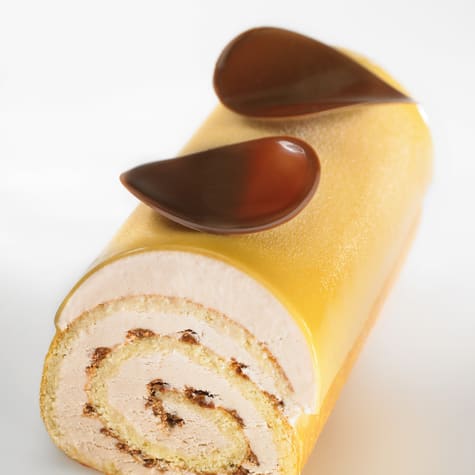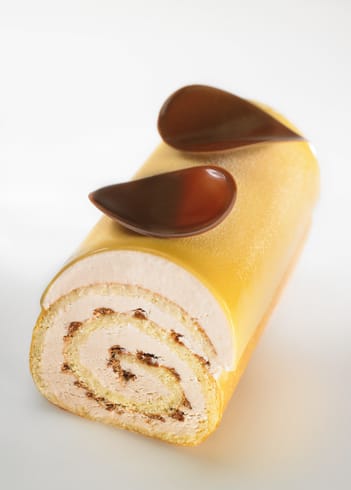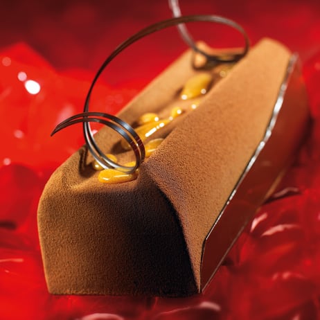Démouler les bûche en passant rapidement les moules sous l’eau chaude. Réserver au congélateur. Ajouter une pointe de poudre Or dans la recette du nappage à pulvériser. Napper les bûches, puis couper à la taille désirée. Décorer avec des disques de chocolat légèrement galbés. Couper les côtés des feuilles de biscuits pour avoir une longueur de 52 cm. Placer les biscuits sur des feuilles de papier sulfurisées, puis imbiber chaque feuille de biscuit avec 500 g de sirop d’imbibage vanille. Placer les biscuits imbibés environ 10 min au congélateur. Etaler 900 g de crème glacée praliné puis à l’aide d’une poche pâtissière, dresser 180 g de Praliné Fruité Craquant directement sur la crème glacée praliné. Passer à nouveau 5 min au congélateur. Rouler les biscuits glacés, puis placer dans les moules U avec le papier sulfurisé. A l’aide d’une plaque, exercer une légère pression sur la surface de la bûche, afin de créer un plat qui évitera à la bûche de rouler ultérieurement. Placer au surgélateur 1 heure puis démouler. Réserver les moules. A l’aide d’une poche pâtissière, dresser 450 g de crème glacée praliné en forme de larmes au fond du moule U, puis placer immédiatement la bûche sur la crème glacée. Presser légèrement de façon à écraser la crème glacée contre les parois du moules. Surgeler. Démouler les bûche en passant rapidement les moules sous l’eau chaude. Réserver au congélateur. Ajouter une pointe de poudre Or dans la recette du nappage à pulvériser. Napper les bûches, puis couper à la taille désirée. Décorer avec des disques de chocolat légèrement galbés.