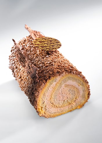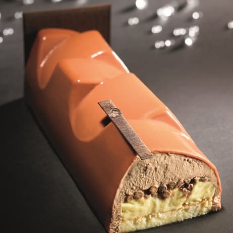 Imbiber chaque feuille de biscuit avec 400 g de sirop d’imbibage citron vanille. Étaler 1000 g de compotée de pomme caramel par biscuit. Étaler ensuite 400 g de ganache montée Tanariva sur les pommes caramel puis rouler l’ensemble comme une bûche traditionnelle. Serrer la bûche pour obtenir une forme régulière et la placer dans les moules Grand U. Surgeler. Masquer les bûches avec le restant de ganache montée Tanariva. A l’aide du robot coupe, broyer des fèves de couverture lactée afin d’obtenir de petits granulés de chocolat. Attention à ne pas trop mixer le chocolat au risque de le faire fondre. Masquer les bûches avec ces éclats de chocolats. A l’aide du nappage Absolu Cristal chaud, pulvériser les bûches. A l’aide de couverture tempérée et d’une poche sans douille réaliser des décors chocolat dans de la poudre de cacao (voir photo). Décorer et disposer un logo maison.