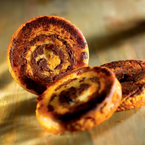 Arrotolare come dei pains aux raisins (a spirale) nel senso della lunghezza. Ritagliare dei dischi di 3 cm di spessore ovvero 90 g e mettere nei flexipans tondi