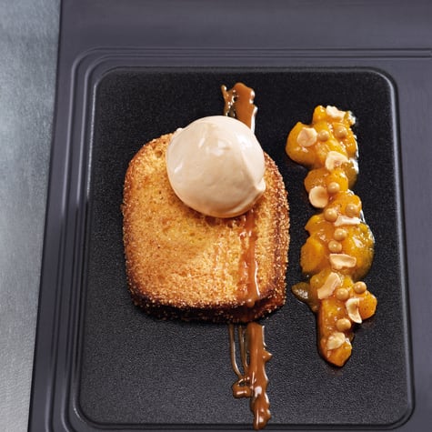 di salsa. Finire il dolce mettendo una pallina di gelato al latte praliné, dei pezzi di frutta secca sablé e delle PERLE CROCCANTI Dulcey.