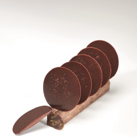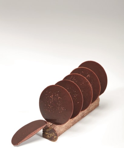Versare delle gocce di cioccolato pre-cristallizato su una striscia di foglio chitarra, ricoprire con una seconda striscia e premere. Separare i due fogli quindi, su un lato versare circa 5 gr di ganache direttamente sul cioccolato. Ricoprire con il secondo foglio in modo che la ganache si trovi tra le due gocce di cioccolato e quindi tagliare con un tagliapasta a 5 cm di diametro. Lasciar cristallizzare a 16 °C.