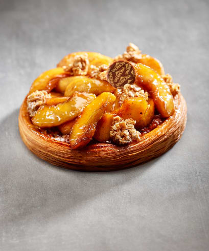 Stendere la pasta per croissant e tagliare i dischi del diametro di 16 cm.Lasciare lievitare a una temperatura di 24 °C circa 2 ore.Preriscaldare per circa 10 minuti a 175 °C il moelleux, quindi congelare.Cuocere i dischi di pasta per croissant a 180 °C e poi a metà cottura, posizionare il disco di moelleux di mandorle al centro e terminare la cottura insieme. Conservare su una griglia.Realizzare un caramello a secco, decuocere con un po 'di praliné e cuocere a fuoco basso dei quarti di mela. Lasciar raffreddare.Disporre le mele cotte sulla torta, spennellare dell’Absolu Cristal e portare ad ebollizione con il 10% di acqua.