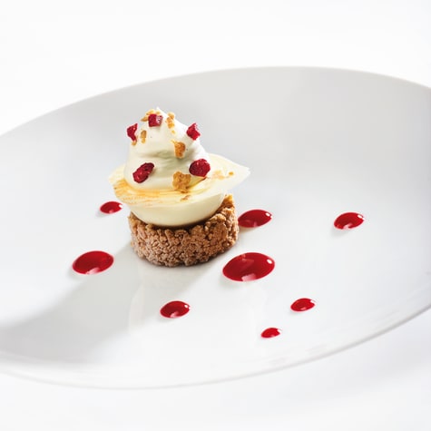 Make the Whipped Ivoire Ganache and the Raspberry Confit. Whip 500 g of the ganache until fluffy. Fill 5cm half-sphere silicone molds with 18g of the Whipped Ivoire ganache and blast freeze for a few minutes. Use a melon baller to hollow out the center of the Whipped Ivoire Ganache half-spheres, smooth over if necessary, and blast freeze. Place 18g of Pressed Ivoire Sweet Shortcrust in a 5cm ring and gently press down. Remove the ring and repeat as necessary. Store the discs in the freezer. Roll some crumbs of Pressed Ivoire Sweet Shortcrust in a little sparkling gold powder, and store in a dry place. Unmold the Whipped Ivoire Ganache half-spheres and place on the discs of Pressed Ivoire Sweet Shortcrust. Spray with the Ivoire Spray Mix for a velvety effect. For the chocolate decoration: Fill a piping bag with some tempered white chocolate. Pipe 5-6cm rings onto an acetate sheet. Sprinkle with pieces of Ivoire Sweet Shortcrust, add a second acetate sheet and flatten gently with a rolling pin. Leave to set. Whip the remaining 650 g of Ivoire Ganache, place in a piping bag with a plain 16mm nozzle and set aside in the refrigerator. Use a blob of ganache to fix a velvety disc on the center of the plate. Fill the center of a half-sphere with Raspberry Confit. Place a ring of chocolate on the half-sphere. Pipe a 25g droplet of Whipped Ivoire Ganache on top. Add some droplets of Raspberry Confit to the plate. Decorate the droplet with a few pieces of Ivoire Sweet Shortcrust and some crispy raspberries.