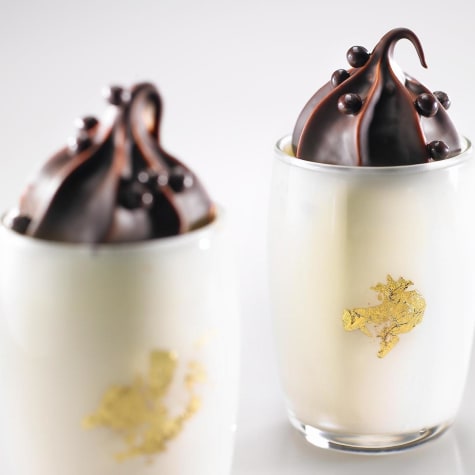 Disponer hoja de Oro en las paredes de los vasos. Bañar el interior de los vasos con la gelée de nata. Con una manga, llenar 2/3 con el namelaka de Ivoire. Insertar un falso cubito de chocolate, haciéndolo desaparecer parcialmente y recubrir con Namelaka. Decorar disponiendo un merengue bañado encima del vaso.