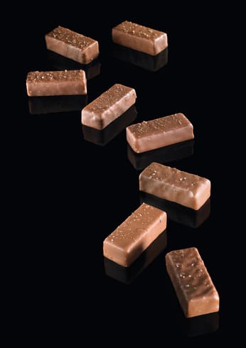Couler la ganache en cadre 34 x 34 cm de 10 mm de hauteur collé sur feuille guitare préalablement chablonné de couverture lactée. Laisser cristalliser 24 à 36 heures à 17°C et 60% d’hygrométrie. Une fois la ganache cristallisée, chablonner à l’aide de couverture lactée tempérée et parsemer immédiatement le chablon avec le mélange poivre et sel. A l’aide de la guitare couper des rectangles de 15 x 36 mm.