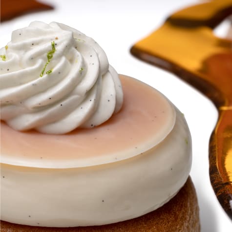 Preparare la brunoise di ananas e disporne circa 5 g per ogni babà.